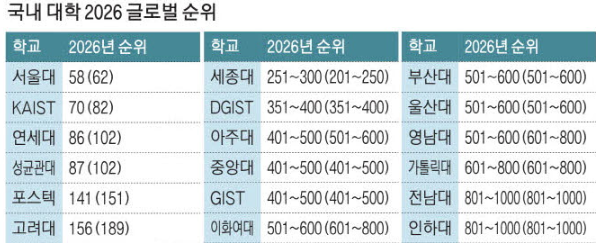 韓대학 약진…세계 100위에 4곳 진입은 처음