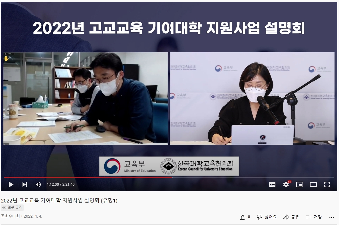 ❒ 한국대학교육협의회(대교협) 입학지원팀은 3월 23일 수요일 10시, 14시 (총2회) "2021년 고교교육 기여대학 지원사업 설명회"를 개최하였다. 코로나-19(COVID-19) 확산방지를 위하여 운영방식은 온라인 화상회의 프로그램 (줌, 유튜브)을 활용하였다.