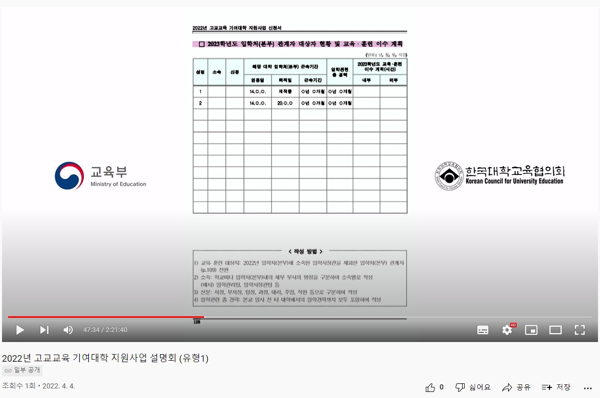 ❒ 이날 설명회에는 전국 4년제 대학 100개교에서 500여명의 교수, 직원, 입학사정관 등 입학처 관계자들이 참석한 가운데 진행되었다. 교육부 대입정책과는 "2022년 고교교육 기여대학 지원사업" 기본계획을 안내하고, 대교협 입학지원팀은 신청서 작성방법 등 사업 전반에 대해 소개하였다.