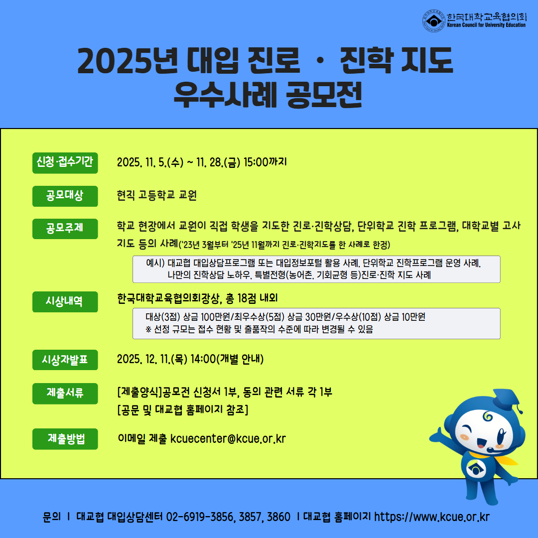 안녕하십니까. 한국대학교육협의회 대입상담센터에서는 고교 학교 현장에서의 진로·진학 내실화 및 우수사례 확산을 위해 2025년 대입 진로·진학 지도 우수사례 공모전을 아래와 같이 개최하고 있습니다. 많은 관심과 참여바랍니다.